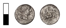 | Reverse: | Warior holding spear and reining in biga r. with l. hand; with r. hand he assists togate figure into biga. In field below, control mark: symbol, XX[V?]. In exergue, [L.] F?ARSVLE[I]. Border of dots. | |