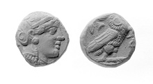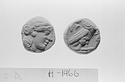 | Obverse: | Head of Athena r., wearing Attic helmet ornamented with palmette and olive leaves; eye of Athena rendered in full profile. | |