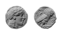 | Obverse: | Head of Athena r., wearing Attic helmet ornamented with palmette and olive leaves; eye of Athena rendered in full profile. | |