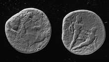 | Reverse: | AθHNA-IωN or AθHNAI-ωN Theseus leaning r., holding club with r. hand and, with l. hand, clutching horn of Minotaur, who falls to r.; border of dots. | |