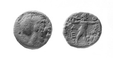 | Reverse: | Α/Ε-Θ Zeus, nude, striding r., hurling thunderbolt in raised r. hand, extending l. arm; at r., star and eagle. | |