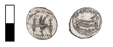 | Obverse: | Ship r., with scepter tied with fillet on prow; above, ANT.AVG; below, III.VIR.R.P.C. Border of dots. | |