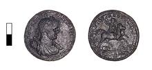 | Reverse: | &AG1;ΠΙ &AG4;Τ-Ρ ΑΠ&AG1;-ΛΛΟ&AG7; Β. Μ&AG1;Ν&AG1;ΜΑΧΟ&AG7; / Μ&AG7;ΤΙΛΗΝΑ/ΙΩΝ Mounted emperor r., spearing fallen enemy. Border of dots. | |