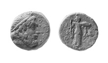 | Obverse: | Head of Zeus r., bound with taenia; border of dots. | |