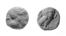 | Reverse: | AθE Owl stg. r., facing; behind, olive spray and crescent. | |