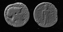 | Reverse: | AθHNAI-ωN Apollo, nude, stg. frontally, with head turned to r., sighting down arrow which is held up in l. hand; r. arm at side holding bow; border of dots. | |