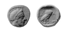 | Obverse: | Head of Athena r., wearing Attic helmet ornamented with palmette and olive leaves. | |