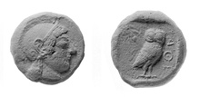 | Description: | Seltman, nos. 328--346 (Group L); Sv. 6.1--17 (3rd-century B.C. context: Cistern L 17:7) Obv. Head of Athena right in un-wreathed Attic helmet. Rev. ΑΘΕ to right of owl standing half right. 3-twigged spray of olive, central with berry, above shoulder on left. | |