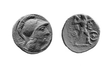 | Obverse: | Head of Athena r., wearing Corinthian helmet. Border of dots. | |