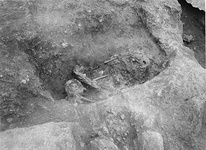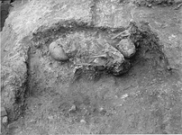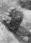 | Description: | Mycenaean grave to west of House N, room 5, with the burial of two young children. Rough rectangular cutting in soft stereo (0.95x0.64x0.28), lying under the western wall of a Geometric house, contained the doubled-up skeletons of two small children. The children had been laid on their sides, one on top of the other (5 and 8 years old respectively). The cup had been placed in an upright position at the bottom of the cutting, before the upper body was put in, but because of the cramped space and double up postures, it seems likely that both burials took place simultaneously. The grave was not lined but had apparently been covered with small stones. | |