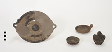 | Description: | Grave over drain A1 (House A). Date based on the fact that the lopas has the upturned handle and the flat rather than domed lid, not found in examples from the later pyres. LT West of House C. Pottery and cinders in pit in stratum. The pyre was excavated in two parts: the first in 1939 (A 18:3) and the second in 1940. Its integrity as a single pyre was not recognized until later. Construction of a Roman house had removed all trace of earlier structures here. Cinders lay under and among the pottery, so the pyre was probably burnt in situ. No bone was recorded. | |