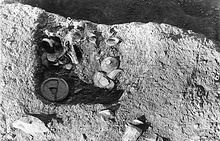 | Description: | Pyre in Room 2, area west of street (RSY=Pyre 12). In courtyard. Artifacts, bone, ash, carbon, and cinders in pit in floor sequence. The rectangular pit was cut into a white strosis with marble chips (ΠΠ 282), filled with red earth, and the surface then trodden hard. The pyre is thus subsequent to the creation of the marbleworking surface, but the hard-trodden surface indicates continuing use of the area. It was disturbed by a robbing trench, not by an original foundation trench of the shed. The amount of ash, carbon, and cinders was small but lay at the bottom of the pit, suggesting that the pyre was burnt in situ. | |