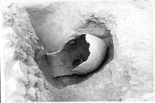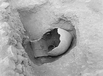 | Description: | RSY Grave 51. The grave lay on the slope of the Areopagus in Roman house O, just east of the line where the hillside is scarped for the foundation of the west wall of the house. Cutting:the pit cut in bedrock into which the burial was set measured 0.95m from north to south and 0.55m from east to west. Its depth was 0.65m. The burial urn, a pithos, was laid in the pit on its side, the mouth toward the south. A foundation wall of the Roman house passed close to the mouth of the pithos, for which we found no cover; one may have been removed when the foundation was laid. The side of the pithos which lay upward had been crushed in by pressure from above, but all the fragments were found inside where they had fallen, and there was no evidence that any hole had been made for the insertion of the body. Skeleton: On the bottom of the pithos were found the skull and some of the leg-bones of a small child who had seemingly been buried in a doubled-up position with the head toward the mouth of the pithos (south). No grave offerings were found. | |