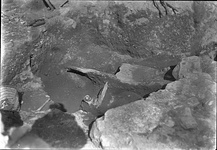 | Description: | Grave 13 in notebook. Two skeletons of small children lay in a pithos which had been put on its side; its mouth was stopped by a stone slab. Most offerings were inside the pithos, but two kantharoi and two oinochoai were placed outside. An animal bone was found under a coarse pitcher left outside the pithos at its mouth; carbonized matter, perhaps from a food offering, was found in one of the kantharoi. No evidence of re-opening, hence this was probably a double funeral. | |