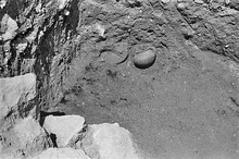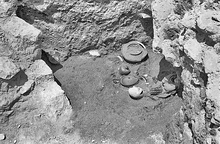 | Description: | Sacrificial Pyre I, Classical Building II. The pyre was set through the original floor level of the northern room of the Classical Building and apparently is the remainder of a ritual conducted when the old floor was raised. The pyre was preserved in a thin strip of undisturbed fill between Pithos III and a Byzantine pit. Bits of bright blue and bright red pigment were found in the fill around the vessels. | |
