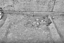 | Description: | Beneath toichobate floor level in Room 1 of Classical Building II, against the south ashlar wall, ca. 1.50m. east of the southwest corner of the building. Deposit of broken pyre pots in small pit, 1.00m. by 0.60m., with ash, bits of carbon and animal bones. Basket 19. | |