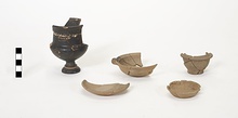 Description:   The remains of a pyre disturbed by the construction of Wall 106. The compact, light brown soil contained some ash and bone and 5 nearly complete pots or saucers.