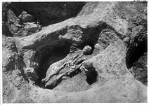 | Description: | "Near or in Grave" (width 0.50m) Grave to the east of the southeast corner of the great court of the Gymnasium. Shallow and superimposed on Well N 11:5. It is a simple cist oriented north and south, with the head on the north side. A number of small field-stones along the east may have come from a lining; the pots were found among these. The other two skulls were found in the area of the grave, but above it, and since there were other grave-like but empty cuttings in the vicinity it is likely there was a small group of graves here. | |