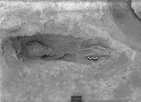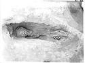 | Description: | Grave (E.L. Smithson: Grave III: SM). The close proximity and similarity of this tomb and tomb M 16-17:1 strongly suggests that they were intentionally laid out in relation to one another and were contemporary. Smithson considered Tomb 1 as containing the mother of the infant inhumed in Tomb 2. The tomb consisted of a rectangular pit cut into bedrock to a preserved depth of 0.30m. Oriented north-south, the tomb measured 0.50m and 0.12-0.15m wide; it was slightly undercut, with traces of a ledge running the length of the tomb on both sides. Fragments of a coarse basin, were intentionally broken and placed above teh tomb as a cover, spanning the full length of the pit. Within the pit, the skeleton of a fetus or newborn infant was placed on its back in an extended position, head to the south. There were no distinct grave offerings. The fill of the tomb pit largely comprised redeposited bedrock chips. AA 317: Owing to the fragility of the bones, the skeleton was encased in a large wax slab, making it impossible to study the human remains without X-rays. | |