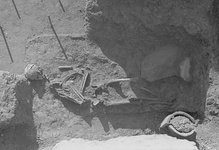 | Description: | Mycenaean Grave under Stoa Terrace, at original north end of Stoa; and PG vases on patches of stones over this burial, and to NE (formerly P 8:7). Cf. Q 8:13. No remains. In some records as Grave XLV. Two patches of fieldstone paving on bedrock located about 3m west of Q 8:7. One of these, to the northeast, measured about a meter across and filled out a natural depression in bedrock; on it lay a kantharos. The other, about a meter to the west and larger, was continuous with the stony filling of a "cist" grave, though to be Mycenaean, directly below. Encountered among the stones of the packing was a fragmentary millstone or quern of Aiginetan andesite, and on the packing were the fragments of a jug and a small oinochoe. Loose filling above these patches of stone contained Mycenaean through Archaic sherds. | |