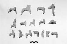 | Description: | Circular pit and irregular cutting north of it. Diam. of pit ca. 0.80m; Dimension of irregular cutting ca. 1.00x1.20m. The pit was dug into bedrock and filled with red earth which was packed with undisturbed pottery. On top were small sherds and broken figurines; below were stacked skyphoi, mostly on east side. At the bottom was a filling of earth and small stones. The pit was well-cut, perhaps as a bedding for a pithos. The irregular cutting contained a similar filling but the pots were stacked, not dumped. The presence of ochre, of trial pieces and of lumps of burnt clay suggest that both cuttings contained refuse from a nearby workshop. This was probably the same establishment to which the well R 17:5 belonged. | |