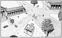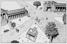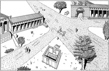 Title:   Perspective drawing of the Stoa Poikile, Altar, Royal Stoa, and Crossroads Sanctuary.