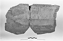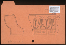 | Description: | Sides and back broken; height preserved. Painted bead and reel along edge of bottom surface. Coarse, buff clay, carefully painted in red and black on a fine greenish cream slip. A 418 (Α 909, from Cave) joins this fragment at the left. <graphic> | |