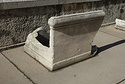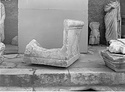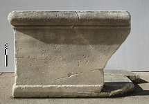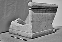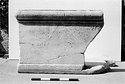| Description: | About half of length and wall to full height preserved on one side. Rectangular sarcophagus with plain projecting base, straight side wall with small and large half round moldings (archaic) at the top, plain flat rim above. Corners strengthened inside with quarter rounds. No trace of painting preserved. On bottom, 0.05m. in from each corner, a rectangular cutting to receive feet of sarcophagus. A rectangular hole cut through the center of the floor, of which only parts of two sides are preserved along the line of break. Island marble. | |