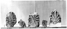 | Description: | Tip and lower right corner missing. Flame palmette above acanthus leaves. From the same series as A 1405 (ΣΑ 212). Pentelic marble. | |