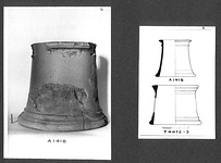 | Description: | About two thirds of circumference preserved with parts of all elements restored in plaster. Spreading profile. Heavy moldings: ovolo surmounted by cavetto, around bottom. Lighter moldings: on top ovolo (?) above; below, a molding not preserved (probably a cavetto on the analogy of P 4072) bordered above and below by a set of two moldings, each formed by two thin rolls of clay. Very friable pinkish buff clay with grits, unpainted. Vertical hole through edge of top. ADDENDA Nearly complete base of a similar curb in ΝΝ Tin 402, from cistern 69/ΜΖ (3rd c. B.C.). Fragments of similar from Ψ cistern (early Roman fill) at 4/ΙΘ, see notebook IV, pp. 723-725, stored in Tin 170 (10 May 1955). | |