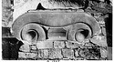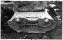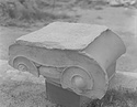 Note in place of eggs a cyma reversa and above this a taenia with fainted maeander. The crowning molding is an ovolo. The eyes of the volutes are large and hemispherical. The angles of the volutes are filled with partial palmettes of which the petals are painted. Abundant stains left by painted ornament, leaf pattern on cyma reversa, maeander on fillet, egg and dart on ovolo, petals on palmettes. Note also three concentric circles on eyes of volutes. Surface finished with toothed chisel, no dowel hole on bottom. Fine work.