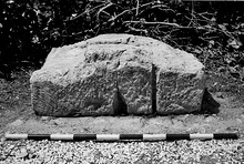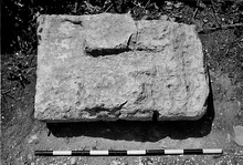 | Description: | Composed of five fragments, broken while removing from wall, block mended 1966. Bottom, back and left face preserved. Probably part of top preserved, although badly worn and cut away by later use as water basin. Broken in front where part of bed molding is preserved. Vague trace of anathyrosis toward back of left side. Dowel hole in bottom 0.226m. from bed molding. Vertical slot cut in left side for leading from above. Bottom of dowel hole (or end of Π-clamp) preserved in top surface, 0.10m. from face, 0.115m. from left side. Back of top hollowed out for basin with part of a channel leading into it. From the Square Peristyle. Kara stone. Cf. A 3399 and A 3400. | |