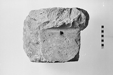 | Description: | One front corner remains with complete profile of hawk's beak. Travertine-like limestone presumably to be stuccoed. From Square Peristyle, South Stoa II. | |