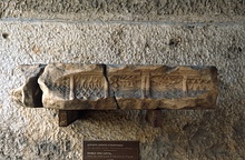 Description:   Fragment preserves part of two adjacent sides. Acanthus and scales on bolsters; egg, dart and lateral half palmettes on spiral end. Two pour channels in top, one dowel hole in bottom.