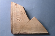 | Description: | Corner fragment of a curved pan-tile, in two joining pieces. Painted red on top surface and unglazed below, with stamped impression of a large palmette on the underside. Coarse pinkish buff clay. | |