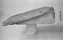 | Description: | From the extreme lower end of a raking cornice, the pedimental slope being ca 0.155m. at 0.58m. length. The width of the corona and the crowning hawk's beak remain. At the lower tip a cutting for a dowel. From same series as A 2990 and A 2751 (another left corner). Two joining fragments added. Island marble. | |