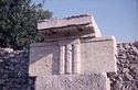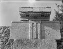 | Description: | Top is flat with a vertical step between a lower front and a higher back part. Cyma reversa bed mold, hawk's beak crown. Cutting for two Π-clamps at each end. In each end a cutting for an end dowel, which was set so as to secure the ends of two adjacent blocks, and was poured through a vertical channel cut in the end of one block. No trace of lead but remains of fine buff cement in the dowel holes. Cuttings of shift bars at each end, top and bottom. Surface finished with drove on visible parts. Top over lower front part smooth finished as though to take marble. Mason's marks on top perhaps from reuse: Ψ Γ Γ Χ. Certainly from period of reuse are the shallow square cuttings in the four corners of the top ca. 0.08m square, presumably for table legs. It was perhaps the makers of the table who trimmed off the back corner of the block (the original back is rough). Whole of under surface well finished with drove. Anathyrosis very regular on one end, less regular but adequate on other. Shallow depression near middle of top toward front perhaps for shift bar used in setting sima. No trace of color; the block was probably not painted. Hard travertine. Cf. also A 1609 and A 3400. <graphic> ADDENDA Bottom cutting for shift bar only at right end (R.F.T.). | |