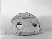 | Description: | Back and edges broken away. Helmet shaped terracotta object with six holes around sides. Nosepiece indicated in solid clay, also crest, decorated with four low bosses. Edge broken away in a manner suggesting that it flared out into a square tile of standard size (ca. 0.50m.). Possibly for insertion on floor above stoking chamber to provide light and air (?). Coarse red clay with bits. Very heavy. Cf. another somewhat similar, A 2715 from Herulian context but with helmet-like aspect less emphasized. No traces of smoke inside either. Cf. also MC 1346. | |