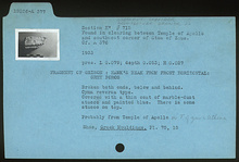 | Description: | Broken both ends, below and behind. Cyma reversa type. Hawk's beak from front horizontal. Covered with a thin coat of marble-dust stucco and painted blue. There is some stucco on top. Probably from Temple of Apollo (or Temple of Zeus Phratrios and Athena Phratira). Cf. A 376. Gray Poros. | |