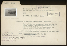| Description: | Part of the top preserved; back, bottom and sides broken. No color preserved on the egg and dart, but the pattern complete. Green color remains in angles at bottom between egg and darts. (A more complete specimen remains in the section.) Pentelic marble. Assigned to the Temple of Ares. Cf. Ptg 329, drawing of restored ceiling coffer. | |