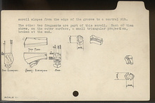 | Description: | Five fragments. The larger fragment, c), is broken at both ends, as is the scroll underneath. Part of the finished top is preserved. It is flattened and well dressed at the back. The front has a raised bevel molding which tapers from left to right. The upper surface consists also of a tapering band, flat. Below the bevel is attached a bit of a scroll, with a deeply carved groove, on both sides. The under surface of the scroll slopes from the edge of the groove to a central rib. Two other fragments, a) and b), are part of this scroll. Each of them shows, on the outer surface, a small triangular projection, broken at the end. Two more fragments, d) and e), also belong. Interpreted as a Kithara of Apollo Patroos S 2154. Pentelic marble. [ADDENDA: more likely coarse island marble. (A.S. 7/16/2014). ADDENDA Originally entered as carved balustrade (see catalogue card). See correspondence with O. Walter, February 1952. <graphic> ADDENDA These 3 are in Nb. p. 134. In the box with them are two fragments, none of the same marble and thus probably form the same kithara. Also in the box is one fragment of a volute in Pentelic marble, presumably from another kithara, unumbered. See nb. p. 668 (A.S. 7/16/2014). | |