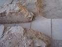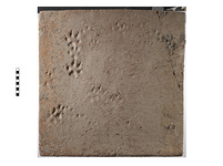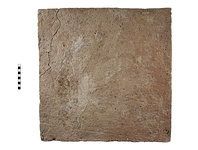 | Description: | Complete. Three fragments mended at one corner. Some lime-based encrustations from use in drain. Large square ceramic tile, slightly thickened at edges. Pale orange fabric with large black and white inclusions. Creamy slip on top surface and sides. Bottom unsmoothed. Top marked by paw prints of one or more canines. | |