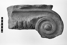 | Description: | One quarter of an Ionic capital preserving a volute, part of the egg and dart echinus and parts of the upper and lower bearing surfaces. Pentelic marble. Cf. A 50. | |