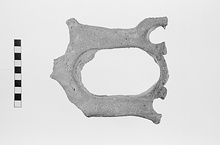 | Description: | Broken all around. A tile with large openings made with arch-shaped strips of clay. Coarse reddish clay. | |