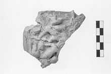 A flat area at base may be where foot has broken away. Irregularly smoothed inside; apparently not wheelmade. Lower body of Skylla preserved: two acanthus leaves of her skirt and foreparts of two dogs. Each dog is biting a human figure in the midriff. The figure at left is upside down, his legs bent, his arms over his head. The figure at right lies towards the right with his knees drawn up. An outstretched arm is visible at upper left edge of fragment. Extremely micaceous, light red fabric (2.5YR 6/6) with many white inclusions and voids; shiny red glaze (ca. 10R 4/8), not adhering well.