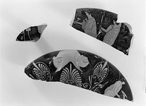 I, pattern around the tondo: stopped-maeander pattern with checkerboard-squares, a dot in each reserved square. A--B, youths leaving home (two youths and a woman). Fragment a (illustrated), on the left, preserves the upper half of a woman to left with a myrtle wreath around her head, dressed in a chiton and himation and holding a phiale in her outstretched right hand. Behind her, a youth (legs and feet missing) stands to left in a chlamys that is fastened at the right shoulder; a petasos hangs down his back and he holds a spear in his right hand. Fragment b preserves the buttocks and a little of the drapery of the other youth on this side and behind him, a bit of the handle ornament (part of vine and lotus). The rest of fragment a gives most of the lotus-palmette configuration at the handle and part of two figures on the other side of the cup: most of a youth (legs missing), nude but for a chlamys over his left shoulder and a fillet around his head, standing to right, a spear over his left shoulder. He faces a woman (part of face) who holds out a phiale toward him in her right hand. Relief contour: profiles. White: fillet.