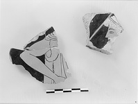 retrograde. Fragment b preserves the right arm and shoulder of a male, probably a youth, standing to right, wearing a chiton under a chlamys fastened at the right shoulder. Preliminary sketch. Relief contour. Dilute glaze: folds of chiton; iris of Phoinix' eye. Red: fillet; inscription. White: hair, moustache, and beard of Phoinix.