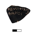 | Description: | Sherd from rim of black glazed bowl. Inscribed on outside. Deme name spelled ΦΙΑΡΙΟS. Spelling of name corrected. | |