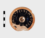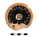 | Description: | Kylix base with black glaze. Chipped at edge. Inscribed on bottom. T for second Θ in name. | |