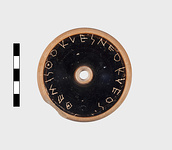 | Description: | Kylix base with black glaze. Chipped slightly on edge. Inscribed on bottom. | |